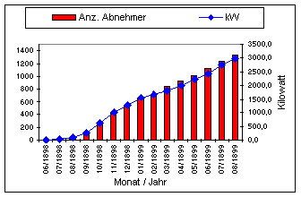 Vergleicht man die maximale Leistung der Dampfmaschinen (zwei Maschinen à 350 PSe, zwei à 700 PSe) mit der durch Wasserkraft gewonnenen Energie (180 PSe), so wird deutlich, dass die Wasserkraft für die Elektrizitätserzeugung im Muffatwerk vor der Jahrhundertwende zwar keine unbedeutende, aber eine doch zweitrangige Rolle gespielt hat. Ausführliche technische Details dieser Anlage sind einem Aufsatz des städt. Baurats F. Uppenborn zu entnehmen, der ca. 1898 nicht nur die einzelne Werke und ihre technische Ausrüstung, sondern auch das Gesamtkonzept der städtischen Stromversorgung minutiös beschrieben hat. Eine aus heutiger Sicht technische Kuriosität sei an dieser Stelle jedoch erwähnt: Da in der Pionierzeit der Elektrizität Ausfälle von Energieerzeugungsanlagen und Lastwechsel im Verbrauch mangels ausreichender Anlagen nicht durch Zu- und Abschalten von Kraftwerken im Leitungsnetz ausgeglichen werden konnten, wurden in den Kraftwerken selbst, aber auch in den Unterstationen riesige Akkumulatoren zwischengeschaltet. Für den „Stromkreis“ der Privathaushalte, der aufgrund abweichender Spannung und Verteilung von denen für Straßenbeleuchtung und für Straßenbahnbetrieb getrennt geführt wurde, hatte diese Batterieanlage „…eine Kapazität von 4536 Ampèrestunden und eine Maximallade- und Entladestromstärke von 1512 Ampère, und kann infolgedessen 6000 Normallampen 3 Stunden lang mit Strom versorgen.“ (F. Uppenborn: Die Versorgung Münchens mit Elektrischer Energie, in: Festschrift zur XIV. Versammlung…) – so der Stand zum ausgehenden 19. Jahrhundert. Damit nichtöffentliche Abnehmer überhaupt mit elektrischem Strom versorgt werden konnten, waren aufgrund der Monopolstellung der Gasanstalt auch hierfür erst die vertraglichen Voraussetzungen zu schaffen. Erst im Juni 1898 wurde der erste nichtöffentliche Abnehmer an das Leitungsnetz angeschlossen. Wie schnell die Nachfrage nach elektrischer Energie in den darauf folgenden Monaten angestiegen ist verdeutlicht die nachstehende Grafik: