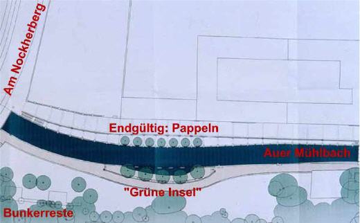 Gleichzeitig werden aus Kostengründen Abstriche bei der Bepflanzung des wieder geöffneten Auer Mühlbaches gemacht. So werden beispielsweise statt der von den Architekten vorgesehenen Spitzeichen billigere und leider auch einfachere Pappeln gegenüber der so genannten „Grünen Insel“ gepflanzt.